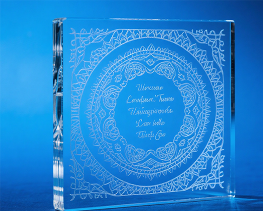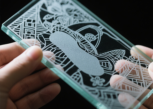 CO₂ లేజర్ గాజు ఉపరితలం ద్వారా బాగా గ్రహించబడుతుంది మరియు సాధారణంగా ఉపరితల చెక్కడం కోసం ఉపయోగించబడుతుంది. CO₂ లేజర్ యొక్క చెక్కడం ప్రభావం మంచుతో కూడిన, తెల్లటి నమూనాగా కనిపిస్తుంది, ఇది ప్రకటనలకు, కళాత్మక అలంకరణకు మరియు బహుమతి అక్షరాలకు అనుకూలంగా ఉంటుంది. అతినీలలోహిత (UV) లేజర్లు, మరోవైపు, తక్కువ తరంగదైర్ఘ్యాన్ని కలిగి ఉంటాయి మరియు తక్కువ ఉష్ణ-ప్రభావిత జోన్తో "కోల్డ్ ప్రాసెసింగ్" మోడ్లో పనిచేస్తాయి. UV లేజర్లు చక్కటి గీతలు, QR కోడ్లు మరియు లోగోలను ఉత్పత్తి చేయగలవు.